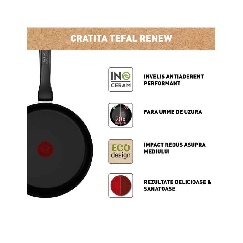 La sauteuse Tefal Renew Black 24 cm combine une conception écoresponsable et une performance exceptionnelle au quotidien. Son corps en aluminium 100 % recyclé réduit l'impact environnemental tout en garantissant une excellente durabilité. Dotée du revêtement céramique Inoceram, cette sauteuse offre une glisse parfaite, une résistance accrue et une surface qui reste propre, sans taches ni dégradation. Grâce à la technologie Thermo-Signal™, l'ustensile indique précisément lorsque la température idéale est atteinte, assurant une cuisson parfaitement maîtrisée. Sa base Thermo-Fusion™ garantit une diffusion homogène de la chaleur et une compatibilité totale avec toutes les tables de cuisson, y compris l’induction. Un ustensile fiable, moderne et performant pour cuisiner facilement chaque jour.